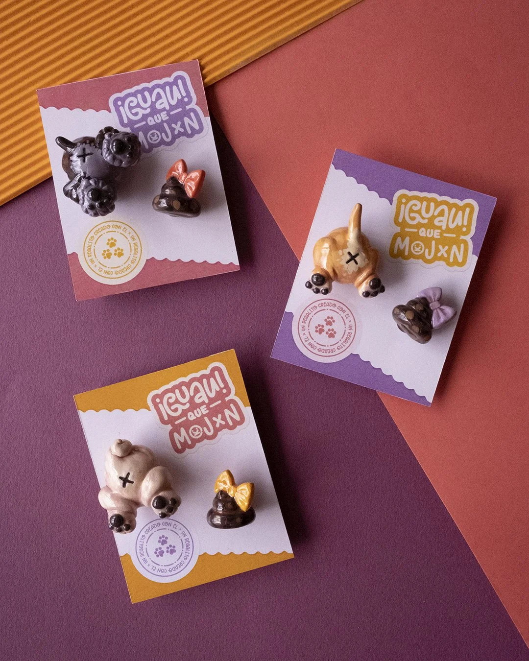 ¡Guau Qué Mojón! is a series of art toys inspired by those little, and sometimes mischievous, gifts our dogs lovingly leave behind, paired with the unmistakable look they give us when they do. Each piece commemorates that everyday moment, personalized to resemble the dog of the person who commissions it.